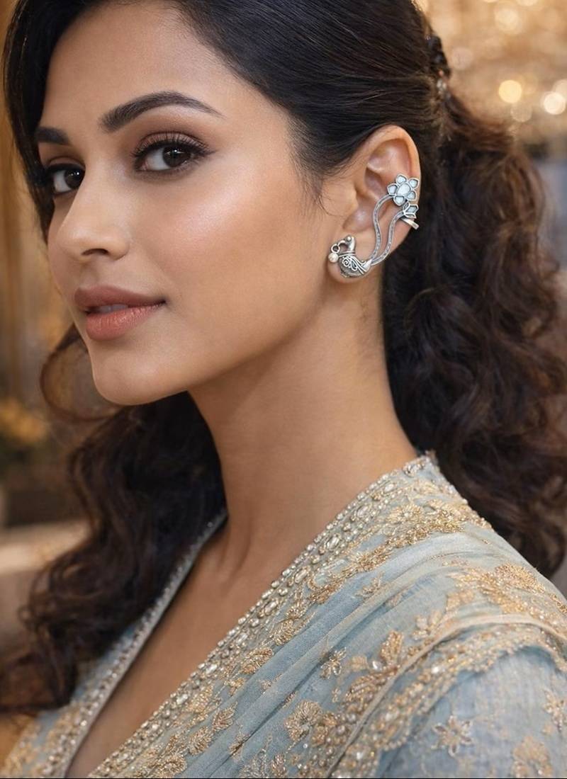 Oxidized silver peacock ear cuff|indian traditional bugadi earrings
