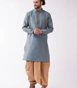 Fabric: Silk Blend | Contents: Kurta And Dhoti SetBanarasi Jacquard Knee Length Kurta Aith Embellished Buttons And Traditional Pattern DhotiMedium length and Regular Fit. Our Kurta fitting is usually slightly relaxed compared to a Regular Shirt's fitting. Select your Kurta size based on your chest dimension. Note: if one has a heavier abdomen compared to chest then he should select one size bigger kurta. Our Churidar Pajamas have drawstrings and a separate pocket attached to it. The pyjama bottom mohri is usually kept narror to bring out the best possible churi look. Although popularly known as Kurta Pyjama but this ethnic wear for men can be suitably used as pathani suit for men stylish, jubba for men, panjabi for men or khan dress for men stylish. Most material used for kurta under 300 tensil count only. These are good alternative to a Indo western or a sherwani. Check out for kurta for mens new looks, kurta for mens wedding, punjabi kurta for men.All our kurtas have five inches loosening over the body measurement. So if your chest round measurement is 38 inches then you should go for a 38 (Medium) size Kurta which will have a garment ready chest measurement of 43 inches. We offer six sizes - Small = 36 (Chest - 41), Medium = 38 (Chest - 43), Large = 40 (Chest - 45), X- Large = 42 (Chest - 47), XX - Large = 44 (Chest - 49) and XXX - Large = 46 (Chest - 51). Suitable for: Party, Weddings, Regular Wear, Celebrations, Occasions, Festivals, Lohri, Pongal, Makar Sakranti, Baisakhi, Holi, Eid, Raksha Bandhan, Dussehra, Diwali, Navratri, Pooja, Christmas, Onam, Ganesh Chaturthi, Janmasthmi and Gifts for Mens.Wash Care Instructions: Dry Clean preferably or cold light wash.Disclaimer: We have made a consistent effort to make the colors and finishes similar to the image of the products you see on screen. However, the actual product and the images on the website can differ! Customer's discretion is advised.