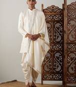 Fabric: Viscose | Contents: a Mirror work Embellished Viscose Kurta For Men with Cowl Pattern Dhoti Set And A Embellished DupattaMirror work Embellished Viscose Kurta For Men with Cowl Pattern Dhoti Set And A Embellished DupattaMedium length and Regular Fit. Our Kurta fitting is usually slightly relaxed compared to a Regular Shirt's fitting. Select your Kurta size based on your chest dimension. Note: if one has a heavier abdomen compared to chest then he should select one size bigger kurta. Our Churidar Pajamas have drawstrings and a separate pocket attached to it. The pyjama bottom mohri is usually kept narror to bring out the best possible churi look. Although popularly known as Kurta Pyjama but this ethnic wear for men can be suitably used as pathani suit for men stylish, jubba for men, panjabi for men or khan dress for men stylish. Most material used for kurta under 300 tensil count only. These are good alternative to a Indo western or a sherwani. Check out for kurta for mens new looks, kurta for mens wedding, punjabi kurta for men.All our kurtas have five inches loosening over the body measurement. So if your chest round measurement is 38 inches then you should go for a 38 (Medium) size Kurta which will have a garment ready chest measurement of 43 inches. We offer six sizes - Small = 36 (Chest - 41), Medium = 38 (Chest - 43), Large = 40 (Chest - 45), X- Large = 42 (Chest - 47), XX - Large = 44 (Chest - 49) and XXX - Large = 46 (Chest - 51). Suitable for: Party, Weddings, Regular Wear, Celebrations, Occasions, Festivals, Lohri, Pongal, Makar Sakranti, Baisakhi, Holi, Eid, Raksha Bandhan, Dussehra, Diwali, Navratri, Pooja, Christmas, Onam, Ganesh Chaturthi, Janmasthmi and Gifts for Mens.Wash Care Instructions: Dry Clean preferably or cold light wash.Disclaimer: We have made a consistent effort to make the colors and finishes similar to the image of the products you see on screen. However, the actual product and the images on the website can differ! Customer's discretion is advised.