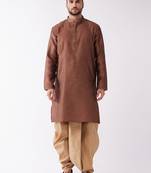 Fabric: Silk Blend | Contents: Kurta And Dhoti SetBanarasi Jacquard Knee Length Kurta Aith Embellished Buttons And Traditional Pattern DhotiMedium length and Regular Fit. Our Kurta fitting is usually slightly relaxed compared to a Regular Shirt's fitting. Select your Kurta size based on your chest dimension. Note: if one has a heavier abdomen compared to chest then he should select one size bigger kurta. Our Churidar Pajamas have drawstrings and a separate pocket attached to it. The pyjama bottom mohri is usually kept narror to bring out the best possible churi look. Although popularly known as Kurta Pyjama but this ethnic wear for men can be suitably used as pathani suit for men stylish, jubba for men, panjabi for men or khan dress for men stylish. Most material used for kurta under 300 tensil count only. These are good alternative to a Indo western or a sherwani. Check out for kurta for mens new looks, kurta for mens wedding, punjabi kurta for men.All our kurtas have five inches loosening over the body measurement. So if your chest round measurement is 38 inches then you should go for a 38 (Medium) size Kurta which will have a garment ready chest measurement of 43 inches. We offer six sizes - Small = 36 (Chest - 41), Medium = 38 (Chest - 43), Large = 40 (Chest - 45), X- Large = 42 (Chest - 47), XX - Large = 44 (Chest - 49) and XXX - Large = 46 (Chest - 51). Suitable for: Party, Weddings, Regular Wear, Celebrations, Occasions, Festivals, Lohri, Pongal, Makar Sakranti, Baisakhi, Holi, Eid, Raksha Bandhan, Dussehra, Diwali, Navratri, Pooja, Christmas, Onam, Ganesh Chaturthi, Janmasthmi and Gifts for Mens.Wash Care Instructions: Dry Clean preferably or cold light wash.Disclaimer: We have made a consistent effort to make the colors and finishes similar to the image of the products you see on screen. However, the actual product and the images on the website can differ! Customer's discretion is advised.