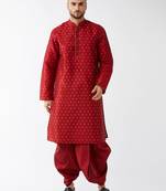 Fabric: Silk Blend | Contents: Kurta And Dhoti SetSilk Blend Jacquard Calf Length Kurta And Traditional DhotiMedium length and Regular Fit. Our Kurta fitting is usually slightly relaxed compared to a Regular Shirt's fitting. Select your Kurta size based on your chest dimension. Note: if one has a heavier abdomen compared to chest then he should select one size bigger kurta. Our Churidar Pajamas have drawstrings and a separate pocket attached to it. The pyjama bottom mohri is usually kept narror to bring out the best possible churi look. Although popularly known as Kurta Pyjama but this ethnic wear for men can be suitably used as pathani suit for men stylish, jubba for men, panjabi for men or khan dress for men stylish. Most material used for kurta under 300 tensil count only. These are good alternative to a Indo western or a sherwani. Check out for kurta for mens new looks, kurta for mens wedding, punjabi kurta for men.All our kurtas have five inches loosening over the body measurement. So if your chest round measurement is 38 inches then you should go for a 38 (Medium) size Kurta which will have a garment ready chest measurement of 43 inches. We offer six sizes - Small = 36 (Chest - 41), Medium = 38 (Chest - 43), Large = 40 (Chest - 45), X- Large = 42 (Chest - 47), XX - Large = 44 (Chest - 49) and XXX - Large = 46 (Chest - 51). Suitable for: Party, Weddings, Regular Wear, Celebrations, Occasions, Festivals, Lohri, Pongal, Makar Sakranti, Baisakhi, Holi, Eid, Raksha Bandhan, Dussehra, Diwali, Navratri, Pooja, Christmas, Onam, Ganesh Chaturthi, Janmasthmi and Gifts for Mens.Wash Care Instructions: Dry Clean preferably or cold light wash.Disclaimer: We have made a consistent effort to make the colors and finishes similar to the image of the products you see on screen. However, the actual product and the images on the website can differ! Customer's discretion is advised.