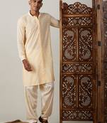 Fabric: Georgette | Contents: a Box Pattern Chikankari Georgette kurta And Patiala For MenBox Pattern Chikankari Georgette kurta And Patiala For MenMedium length and Regular Fit. Our Kurta fitting is usually slightly relaxed compared to a Regular Shirt's fitting. Select your Kurta size based on your chest dimension. Note: if one has a heavier abdomen compared to chest then he should select one size bigger kurta. Our Churidar Pajamas have drawstrings and a separate pocket attached to it. The pyjama bottom mohri is usually kept narror to bring out the best possible churi look. Although popularly known as Kurta Pyjama but this ethnic wear for men can be suitably used as pathani suit for men stylish, jubba for men, panjabi for men or khan dress for men stylish. Most material used for kurta under 300 tensil count only. These are good alternative to a Indo western or a sherwani. Check out for kurta for mens new looks, kurta for mens wedding, punjabi kurta for men.All our kurtas have five inches loosening over the body measurement. So if your chest round measurement is 38 inches then you should go for a 38 (Medium) size Kurta which will have a garment ready chest measurement of 43 inches. We offer six sizes - Small = 36 (Chest - 41), Medium = 38 (Chest - 43), Large = 40 (Chest - 45), X- Large = 42 (Chest - 47), XX - Large = 44 (Chest - 49) and XXX - Large = 46 (Chest - 51). Suitable for: Party, Weddings, Regular Wear, Celebrations, Occasions, Festivals, Lohri, Pongal, Makar Sakranti, Baisakhi, Holi, Eid, Raksha Bandhan, Dussehra, Diwali, Navratri, Pooja, Christmas, Onam, Ganesh Chaturthi, Janmasthmi and Gifts for Mens.Wash Care Instructions: Dry Clean preferably or cold light wash.Disclaimer: We have made a consistent effort to make the colors and finishes similar to the image of the products you see on screen. However, the actual product and the images on the website can differ! Customer's discretion is advised.