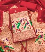 • Product Id : 4550415 • Package Details : 1 Top/1 Bottom/1 Dupatta • Type : Dress Materials • Region : Utter Pradesh, Gujarat, Maharastra, Andhra Pradesh, Karanataka • Occasion : Ceremonial • Type : Banarasi Silk • Look : Designer • Sleeve : Full Sleeve • Stitching : Unstitched • Color : Red • Fabric : Banarasi Silk • Work : Zari Woven Stitching [+]