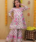 Dress your little princess in elegance with this White & Pink Cotton Kurta Sharara Set, crafted from 100% pure cotton for a soft, breathable, and all-day comfortable fit. The kurta comes with delicate embroidery/prints, a soft round neckline, and easy sleeves, while the flowy pink sharara pants add a festive charm to her look. Perfect for weddings, parties, and celebrations, this set blends traditional style with modern comfort, making it a must-have for every occasion. Easy to care for with machine wash, this outfit ensures your little one shines with grace, comfort, and style. 🌸💖