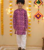 Patola Purple kurta pajama- Vastrarth offers sustainable Boys Kurta Pajama Sets, designed for eco-aware families. Our collections, made from environmentally friendly fabrics, promise both luxury and durability. Perfect for weddings and cultural events, these sets provide a seamless blend of heritage style and contemporary design. Choose ethical fashion for your child's wardrobe essentials. Colour: Purple Top: Knee length kurta, Bottom: Ankle Length pant, Material & Care-Top fabric: Pure Cotton, Bottom fabric: Pure Cotton. Machine Wash with mild detergent only.